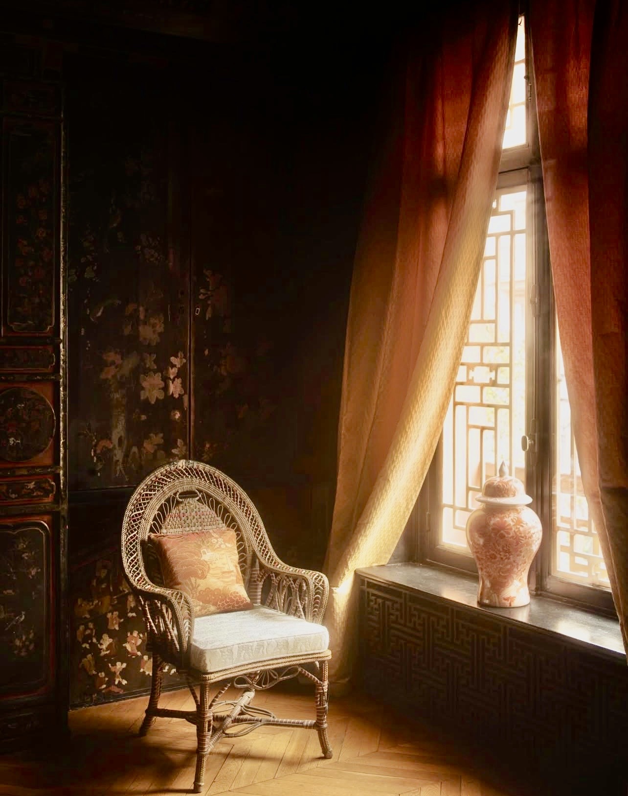 Ces espaces sont habillés des tissus de la nouvelle collection de la Maison Lelièvre, qui trouvent naturellement leur place dans le décor historique de La Pagoda. Le mobilier XIXᵉ, choisi par la Maison Lelièvre dans le goût de l’extrême-orient, structure l’ensemble et sert de support aux créations textiles présentées.